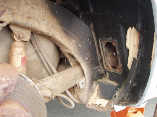 There are eight mounting bolts that hold the fiberglass structure to the frame. I would advise using an anti- seize product like PB Blaster or Liquid Wrench on the bolts before attempting to remove the bolts. It really doesn’t matter which bolts you start removing first. I started with the easiest bolts at the rear and worked my way forward. The very rear mounting bolts are visible even when the tires are on.