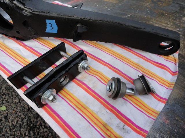 Now that the bearings are ready to go I can move on with the actual trailing arm. Before the trailing arms are loaded down during the assembly process, I decided to install the bushings. With rubber bushings, the rubber has to be compressed in order for the bushing's sleeve to flare and held the two ends firmly together. So once again it is time to make a new tool. I took two scrap pieces of metal and drilled a hold on both ends. On one of the pieces I drilled a 15/16th hole for the flaring tool to go into. From there, I bought a cheap flaring kit from Auto Zone and removed the plunger to flare the bushing sleeve. They do sell a trailing arm tool to compress and flare the sleeve but I decided that I could do without and save the $50 or so for another day.